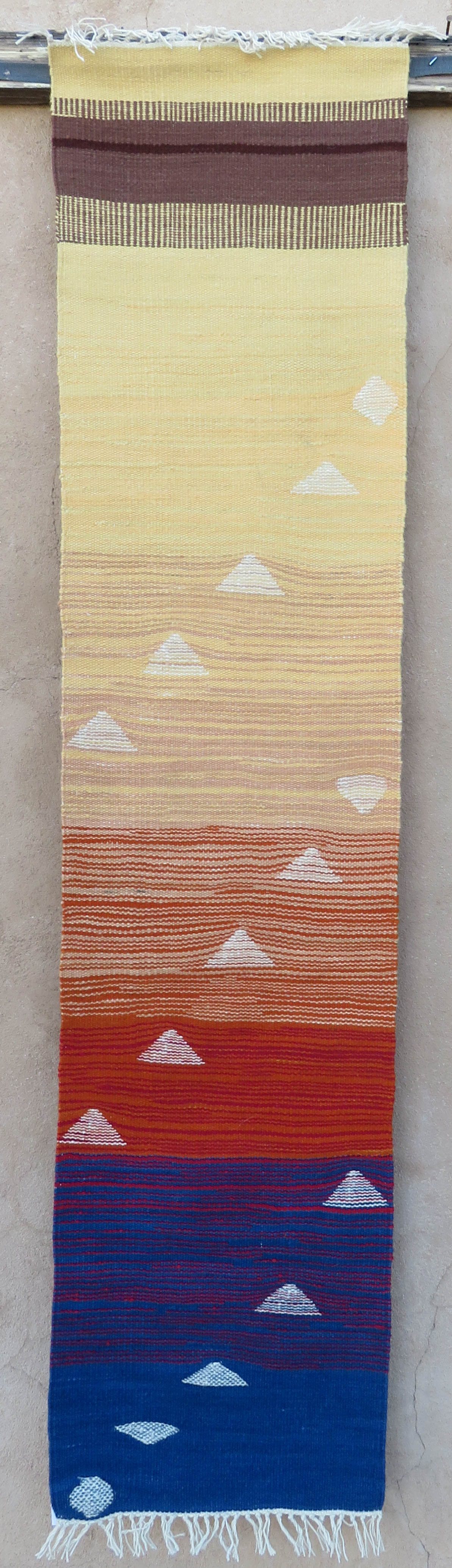 15X60, Gloria Montoya, Modern, Rainbow- Commercial (cardinal), Natural (cota, black walnut, madder root, indigo), and Undyed yarn