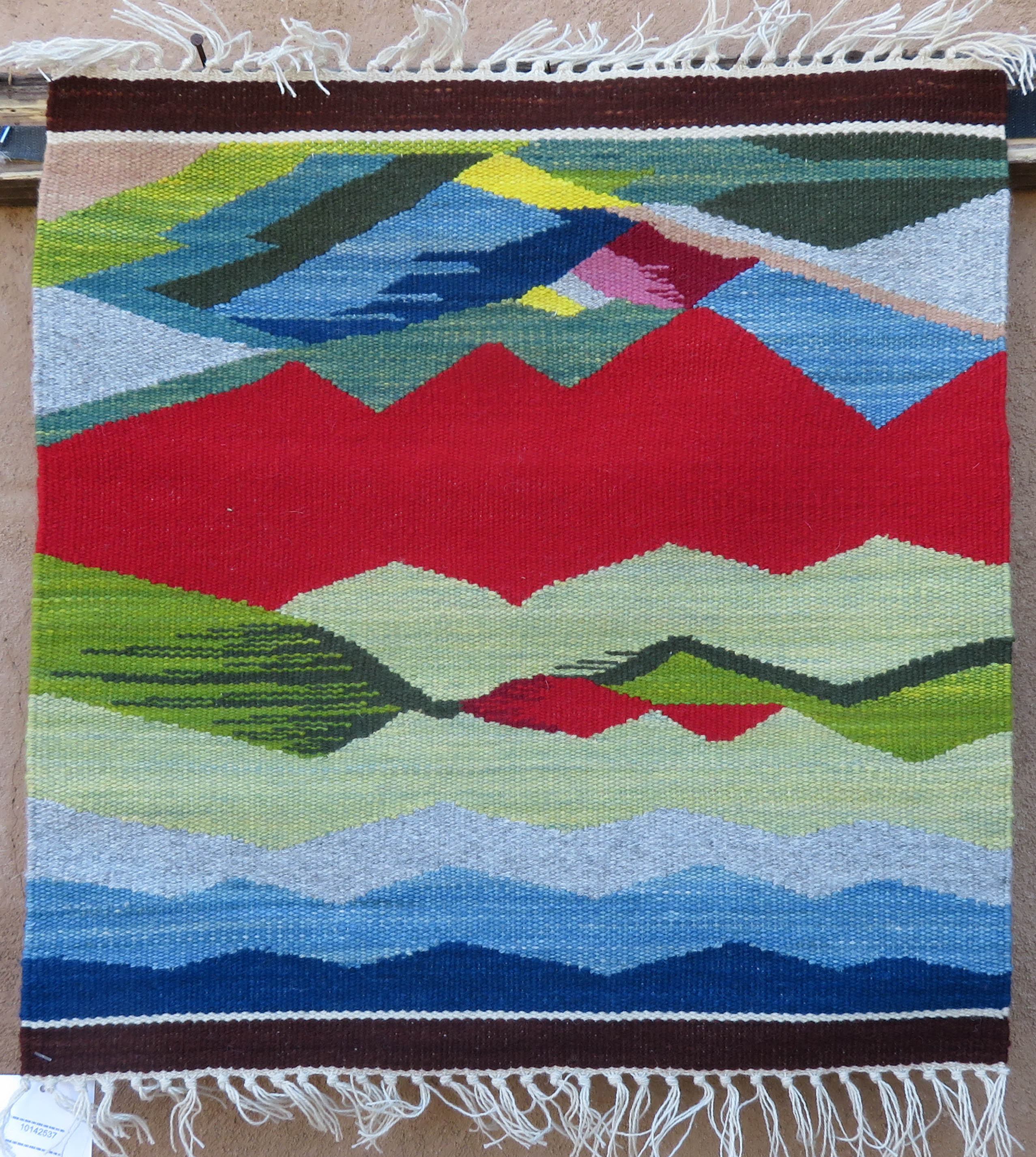 20X20, Gloria Montoya, Pictorial, Rainbow of Commercial and Natural Dyes: Black Walnut, Indigo, Indigo over Chamisa, Chamisa, Cochineal