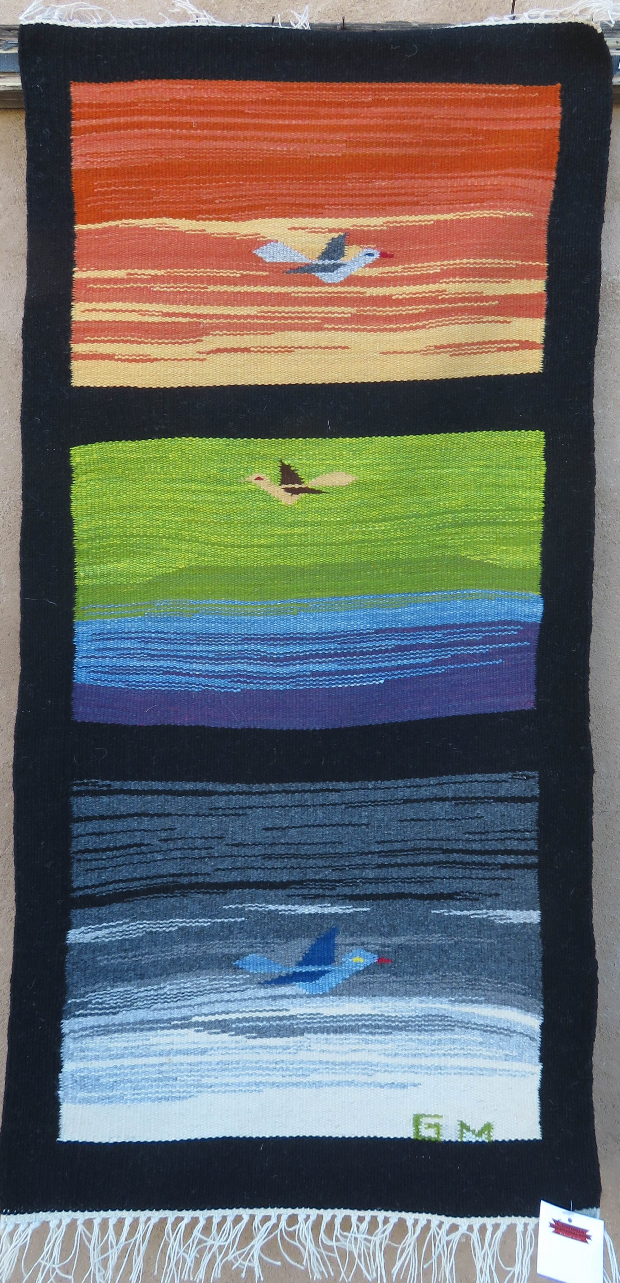 20X40, Gloria Montoya, Modern, Black- Natural, Light Oxford Heather, Blue (Naturally dyed with Indigo), Medium Oxford Heather, Dark Oxford Heather, Yellow (Chamisa), Light Cardinal, Purple (Cochineal over Indigo), Green (Indigo over Chamisa), Orange (Madder Root)
