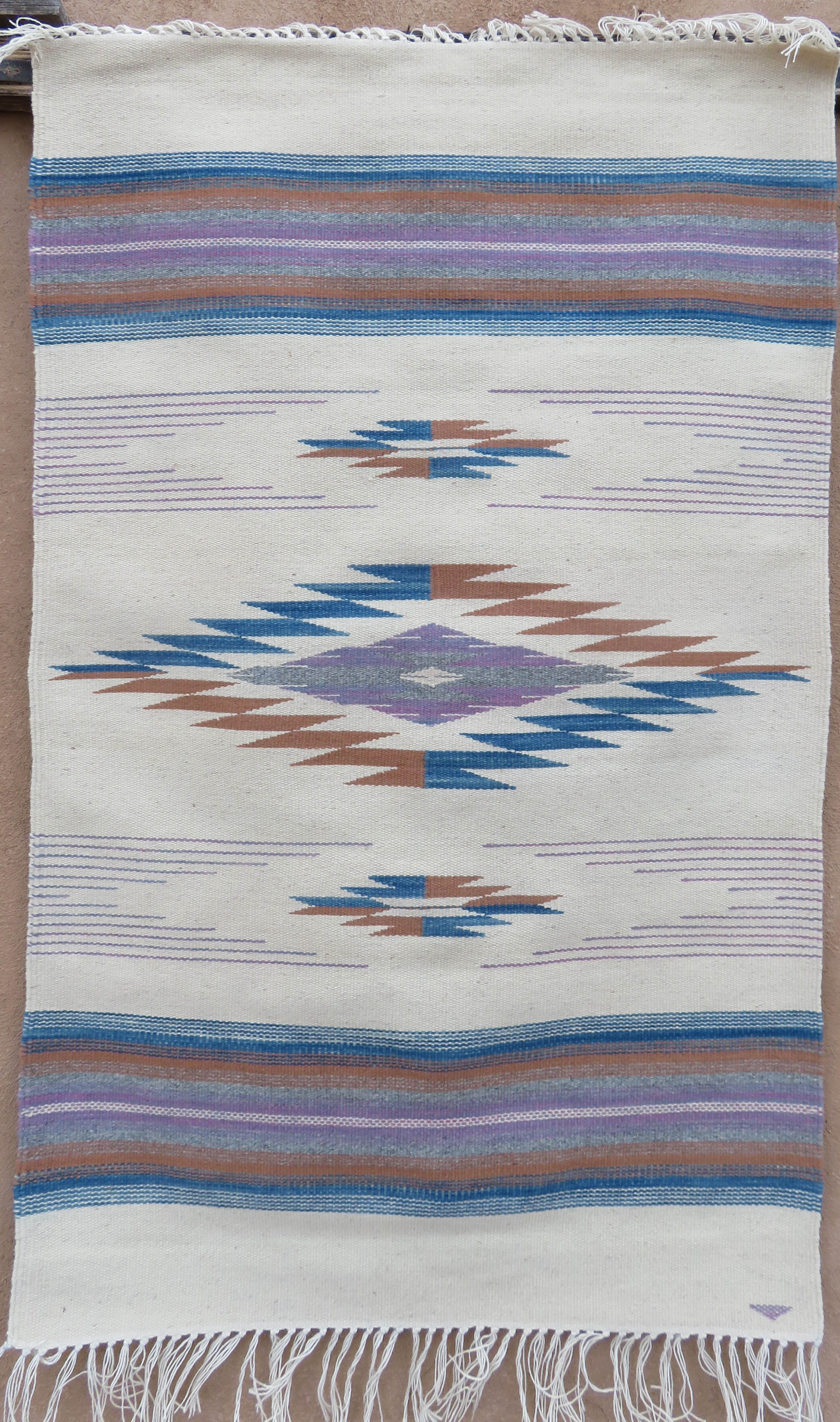 30X45, Chimayo, Valorie Valdez, Natural- Blue (Naturally dyed with Indigo), Brown (Black Walnut), Light Oxford Heather, Purple (Indigo over Cochineal)