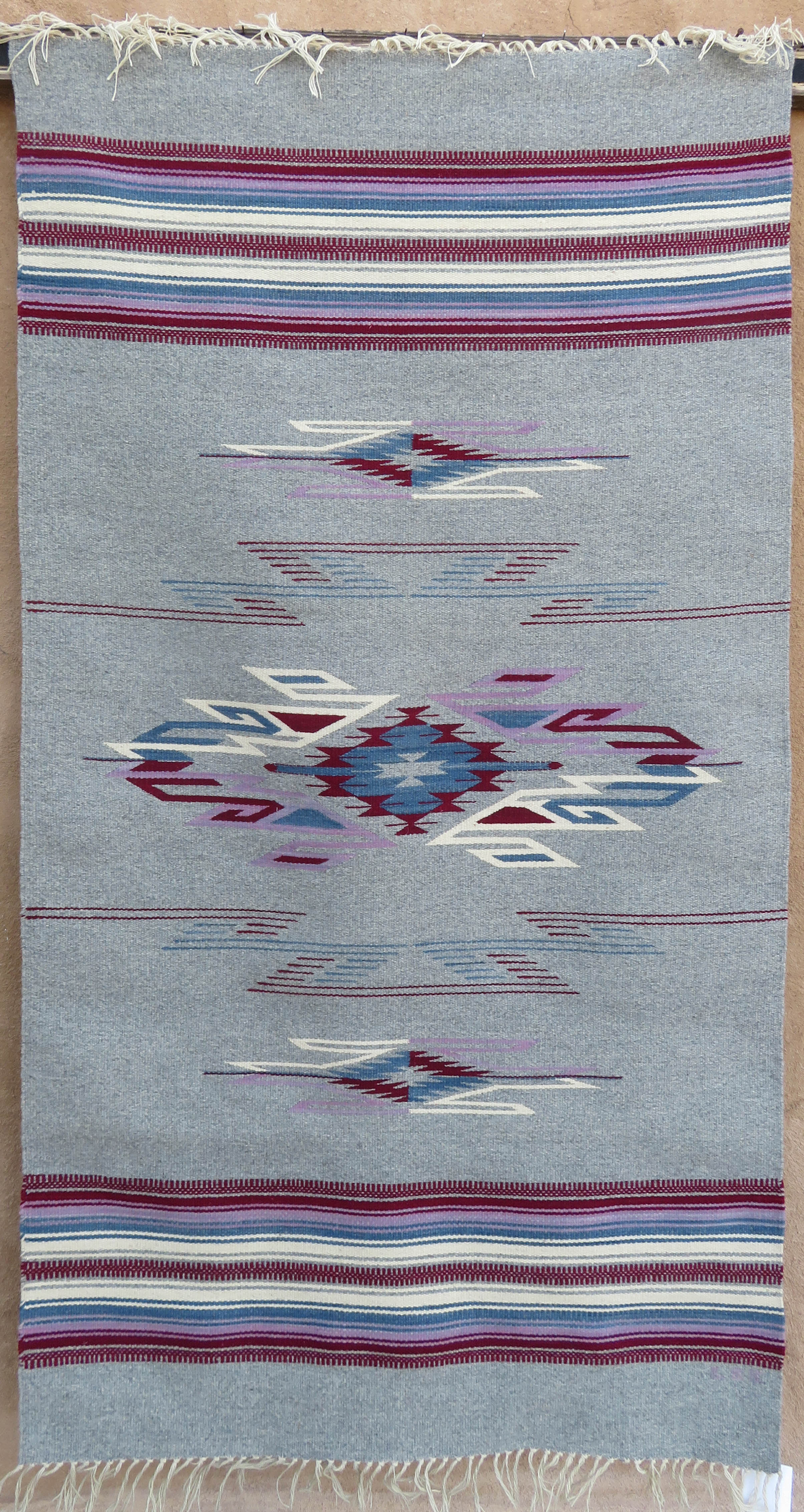36X60, Rudy Lee Valdez, Chimayo, Lt Oxford Heather- Red (naturally dyed with cochineal), Purple (naturally dyed with indigo on cochineal), Blue (naturally dyed with indigo), Natural