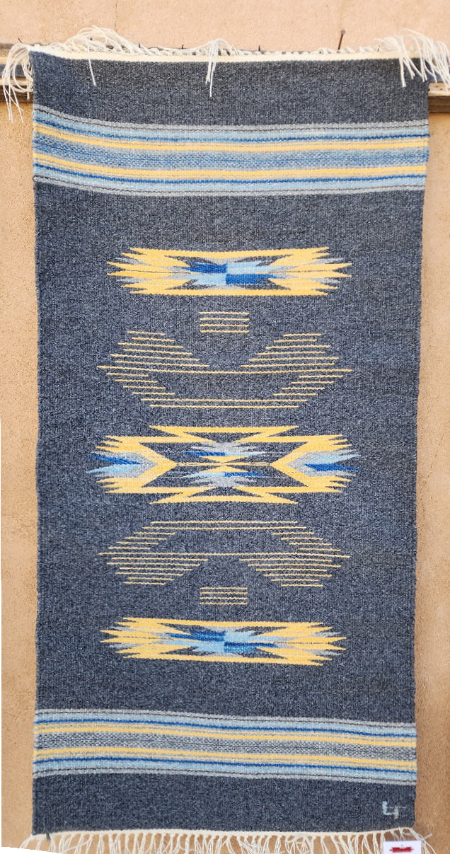20x40, Chimayo by Lisa Trujillo, dark oxford grey with light oxford, natural dyed blues and gold.