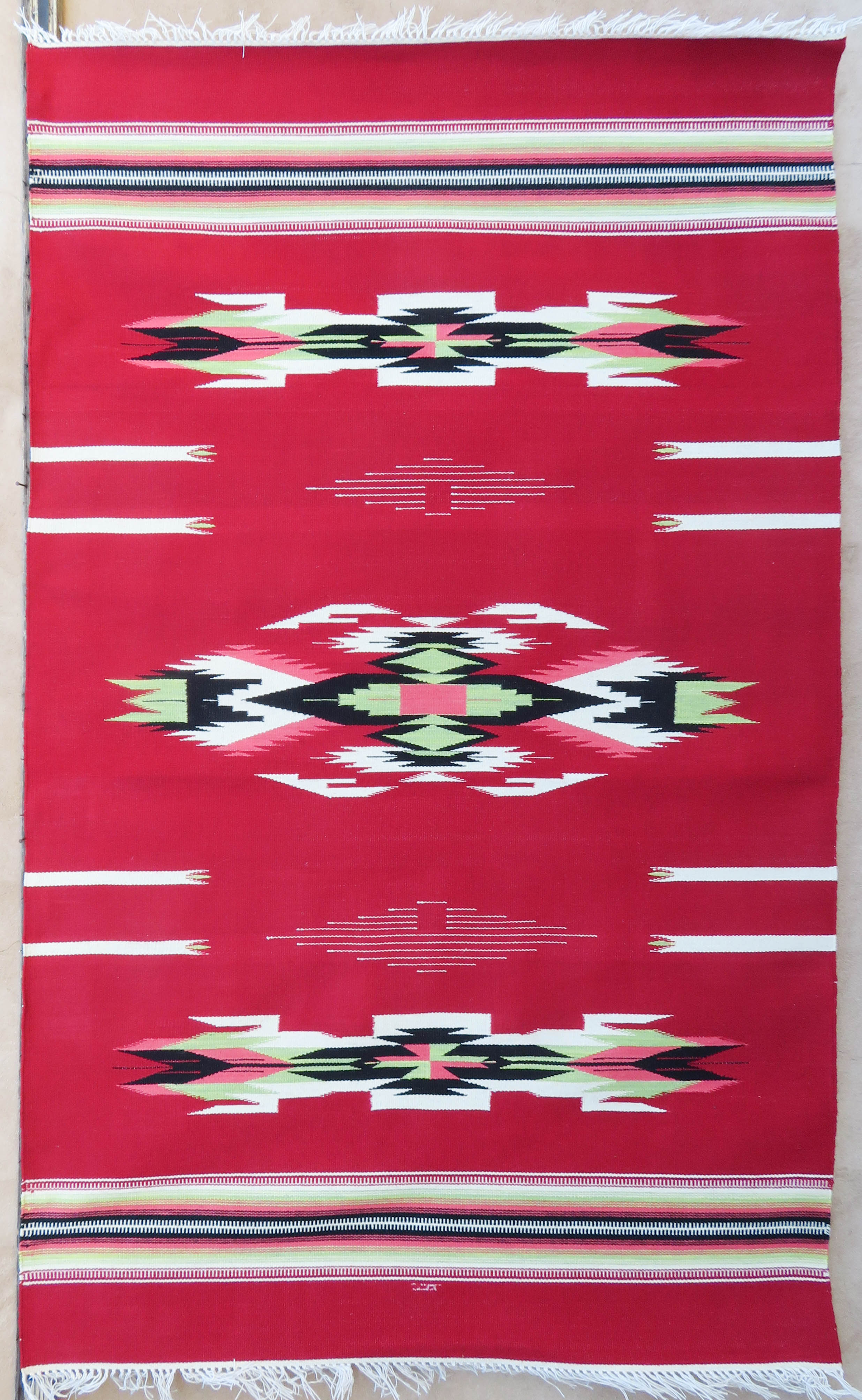 50.5X84, Irvin Trujillo, Chimayo, Light Cardinal- Natural, Green (Naturally dyed with Indigo over Chamisa), Pink (Acid Dyed), Black