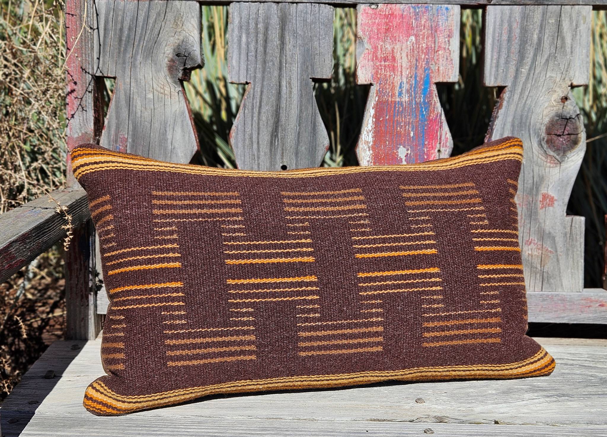 14X24, Shiri Klein, Pillow, CONSIGNMENT, Browns (Black Walnut) and Yellows (Cota), 100% Wool, Hand and commercially dyed yarns, Back= Faux Suede
