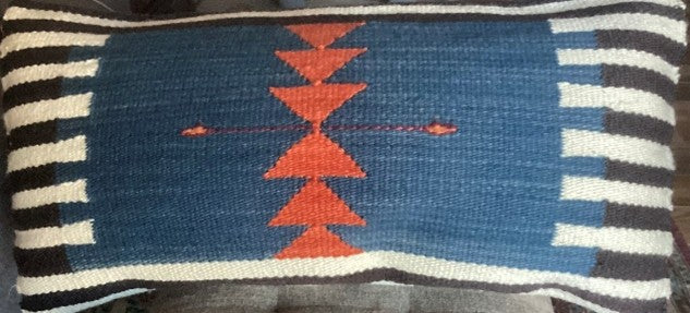 36X16, Pillow, Gretchen Adams, CONSIGNMENT, Blue- Black, White, Orange, Red, Orange Backing, Hand-dyed with Commercial Acid Dyes, 100% Mill Spun Wool Yarn