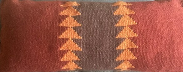 36X16, Pillow, Gretchen Adams, CONSIGNMENT, Red- Orange, Brown, Brown Backing, Hand-dyed with Commercial Acid Dyes, 100% Mill Spun Wool Yarn